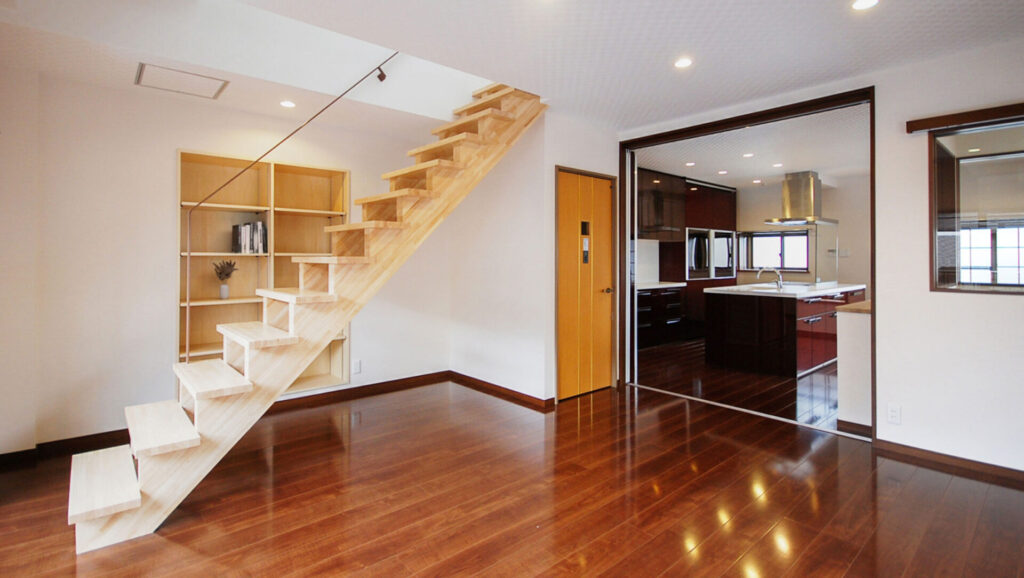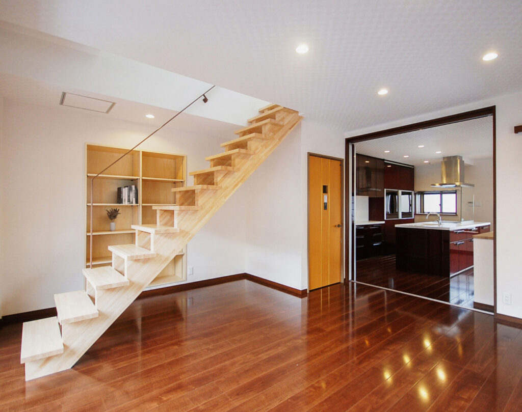 かつて賃貸として使われていた3階部分を、ゆとりある洋室へとリノベーション。新たにスケルトン階段を設け、2階リビングからの動線をスムーズにつなげました。あえて階段室を設けず、開放感のある構造とすることで、リビング全体に広がりと個性をプラス。さらに、バリアフリー設計やエレベーターの導入により、親世帯も安心して快適に暮らせる住まいを実現しています。