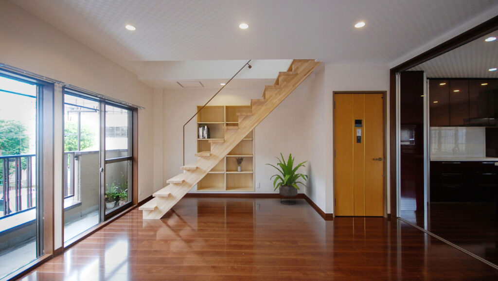 3階の床スラブに開口を設け、2階リビングから直接アクセスできるように、木製のスケルトン階段を新たに設置しました。階段下にある扉は、1階にお住まいの親世帯のために設置されたエレベーターの出入口となっています。