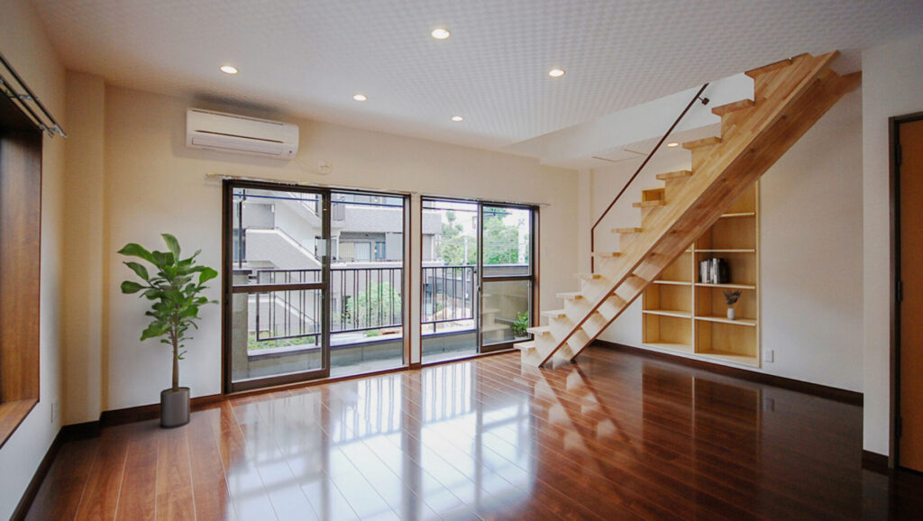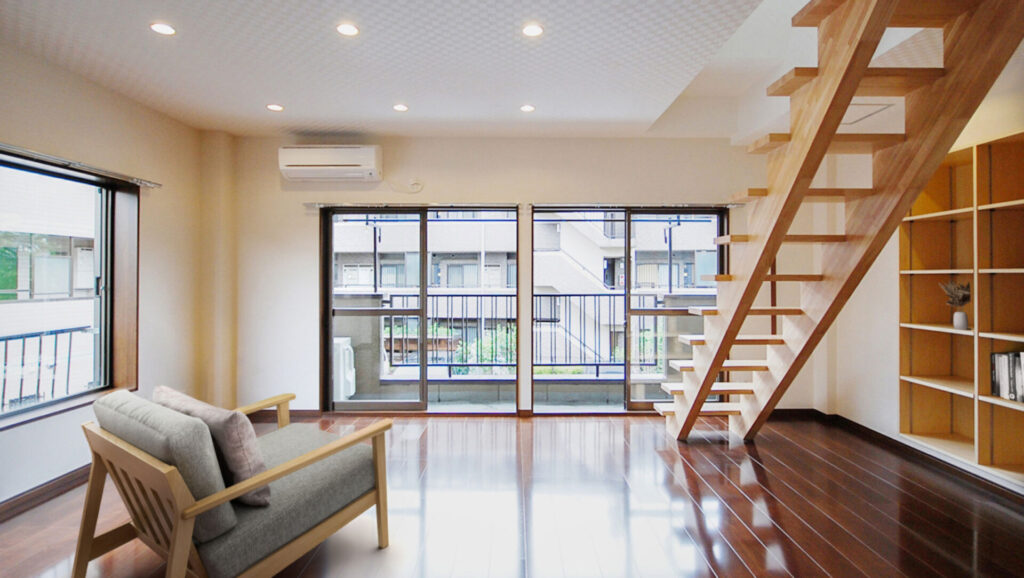 かつての和室と洋室2部屋をひとつにつなげ、広々としたリビングへとリノベーション。落ち着きのあるトーンのフローリングと、大きな窓から降り注ぐやわらかな自然光が、モダンで開放感あふれる空間を演出。