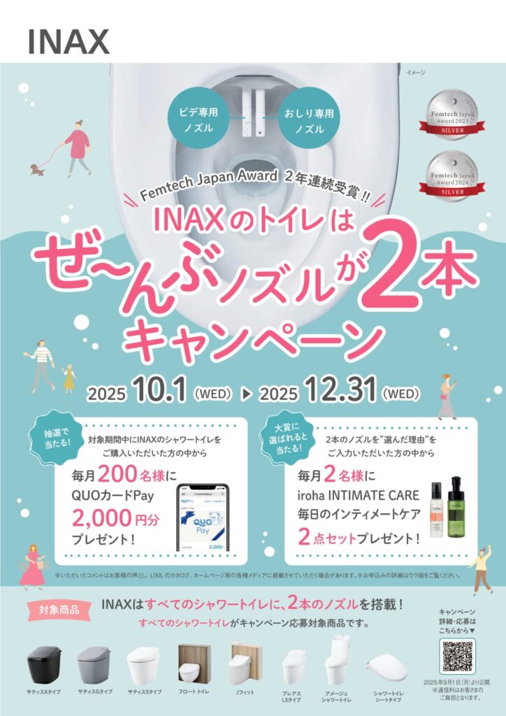 【抽選で当たる】対象期間中にINAXのシャワートイレをご購入いただき、ご応募いただいた方の中から毎月200名様にQUOカードPay2,000円分プレゼント! 【大賞に選ばれると当たる】2本のノズルを選んだ理由をご入力いた