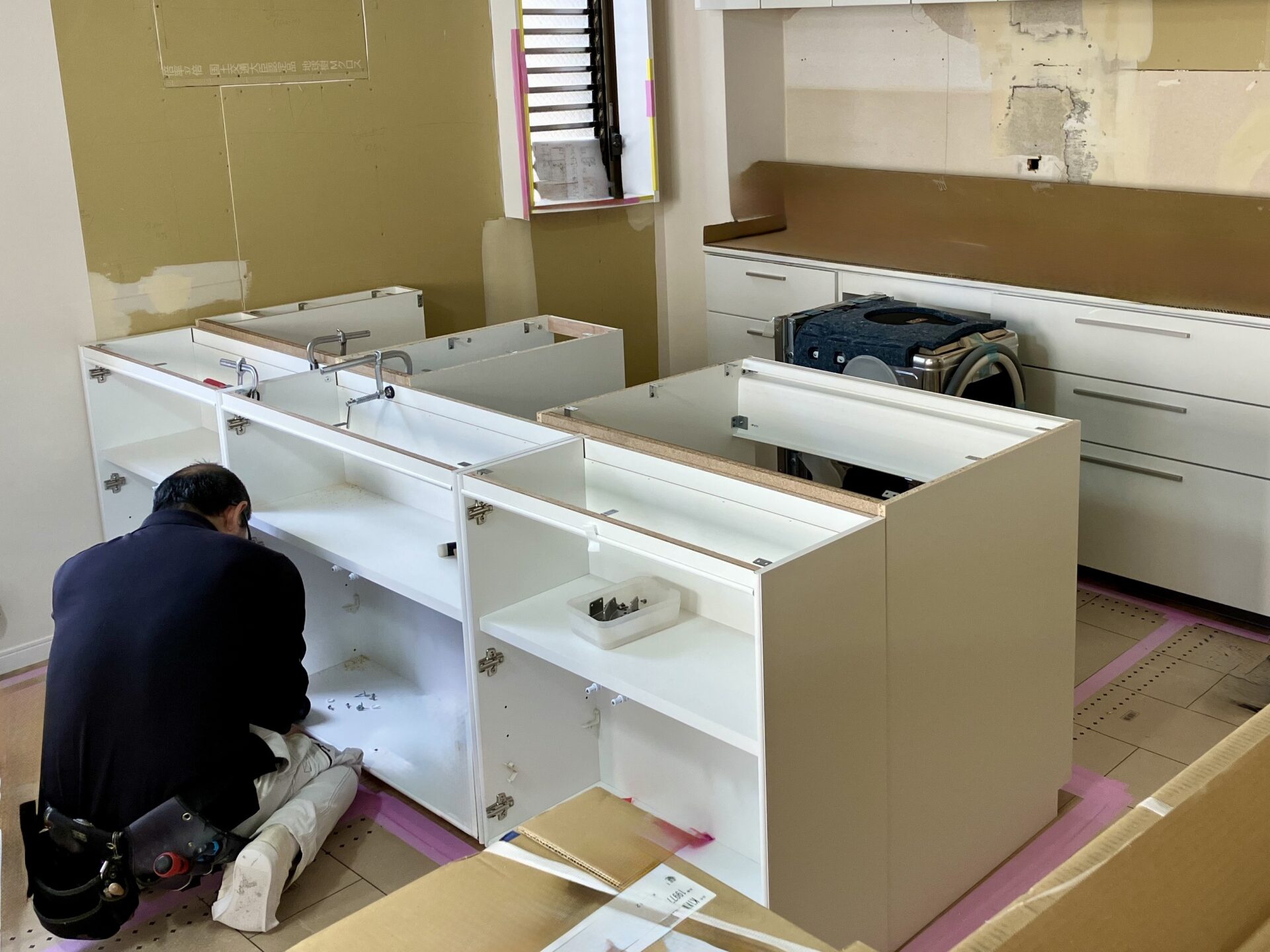 ↓ダイニングキッチンの間仕切り壁を撤去します。既存の対面キッチンから新規アイランドキッチンへ。