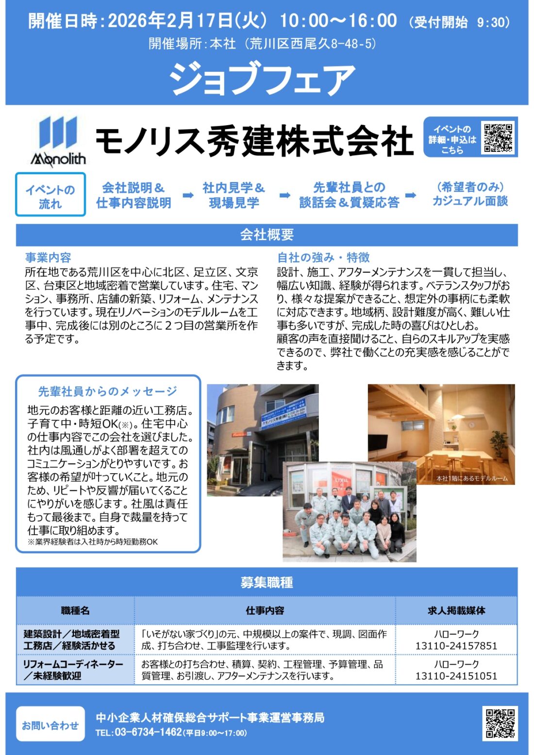 2026年2月17日に、公益財団法人 東京しごと財団主催の「モノリス秀建就職イベント」を弊社にて開催いたします。