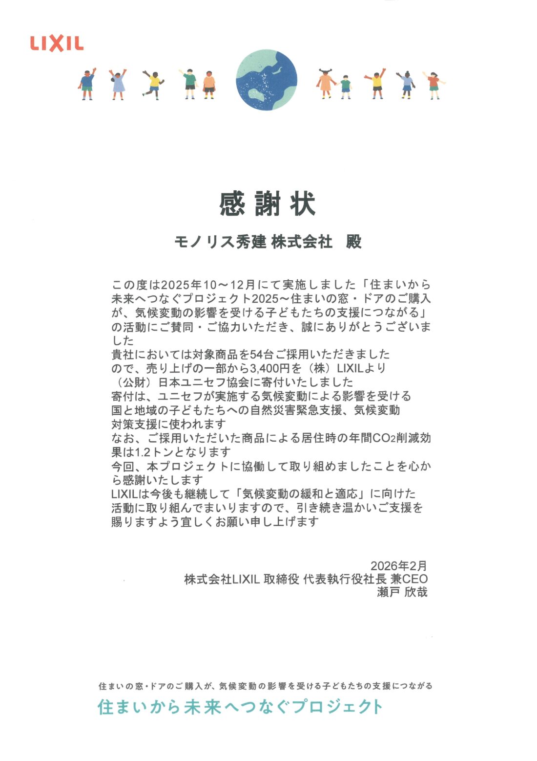 弊社で施工させていただいた窓・ドアを通して、持続可能な社会づくりに貢献できましたことをご報告いたします。