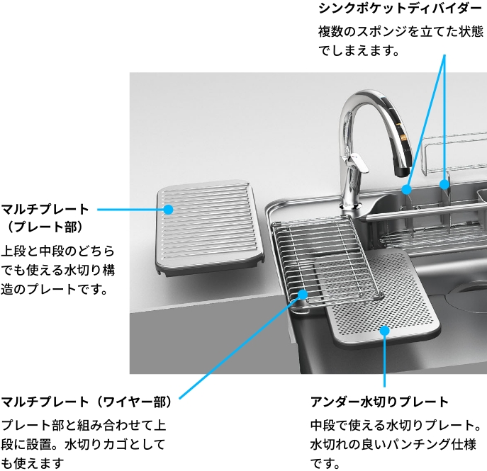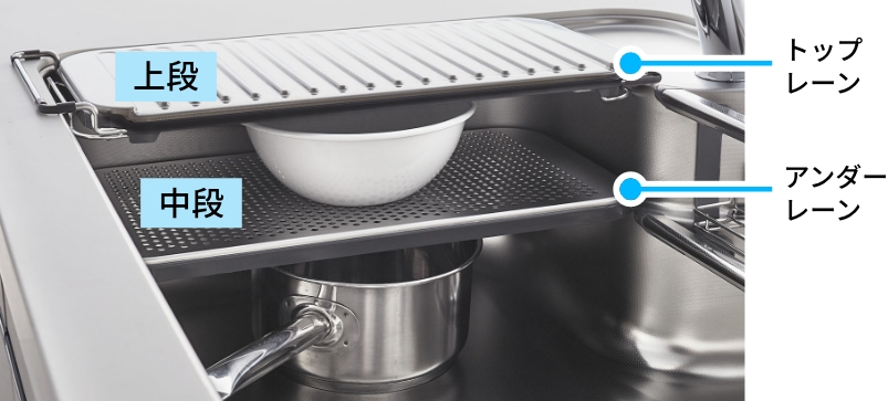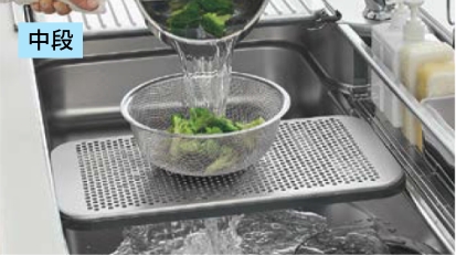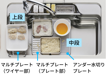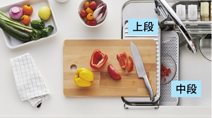 上段にはマルチプレート、下段に水切りプレートを配置すれば、調理スペースが簡単に拡大。ご家族みんなで料理するときなどに便利です。