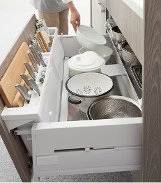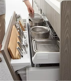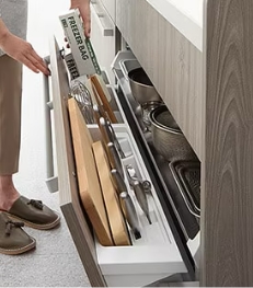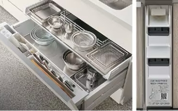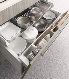 ムダになりがちな引出し上部のスペースが便利な収納に。手が届きやすい高さなので調理中に出し入れしたい物の収納に最適です。