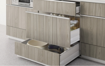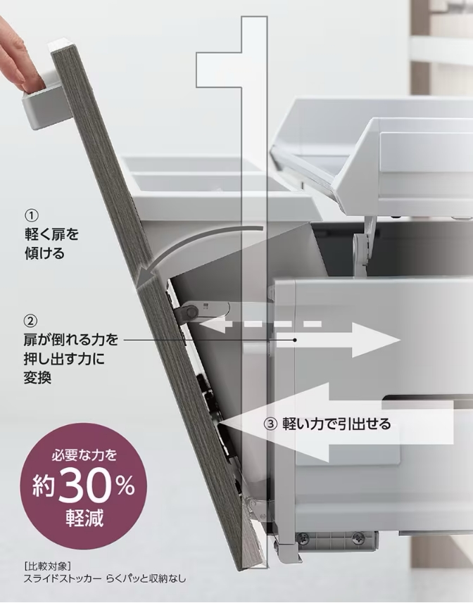 「らくパッと収納」は、キッチンでの作業をスムーズに、ストレスなくするために設計された収納システムです。テコの原理を応用して、軽い力でスッと開き、調理中でも片手でサッと引き出せるため、作業の手を止めずに使えます。また、調理器具や食器を効率よく収納できる設計で、開けたままでも取り出しやすく整理整頓も簡単です。