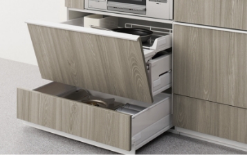 大きめの調理道具や食材の収納スペース。奥行きいっぱいまで収納できるロングスライド引出しで収納量もたっぷり確保しました。