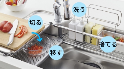 「洗う→切る→移す→捨てる」をシンク周辺で完結。下ごしらえの作業がスムーズになります。