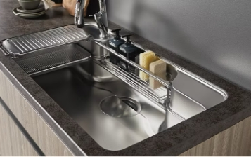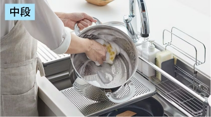 まな板や水切りプレートを上下2段で使えるので、「洗う・切る・捨てる」といった作業がシンク内でスムーズに完結。プレートはスライドできて位置調整も自由自在。限られた作業スペースでも使いやすく、家族と一緒にキッチンに立つときにも便利です。さらに、野菜の下ごしらえをしながら、下段でそのまま水切りやゴミの処理ができるので、「ちょっと置きたい」「さっと流したい」といった細かい動作もストレスなくこなせます。