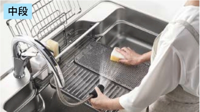 すすぎ前の食器をアンダープレートの上に置くなど、シンク内で汚れ別に仕分けられます。