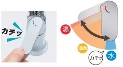 お湯が混合する位置にハンドルがくるとクリックでお知らせする省エネ設計。