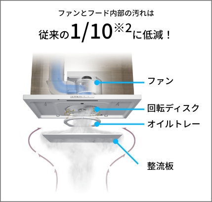 高速回転するディスクが煙の中の油分を強力に捕集。お掃除が面倒だったファンやフード内部には油がほとんど届きません。