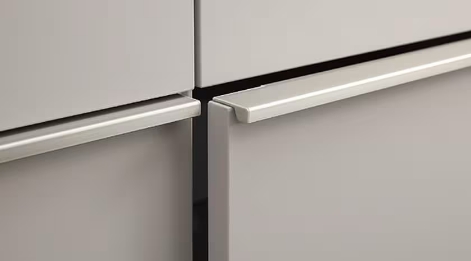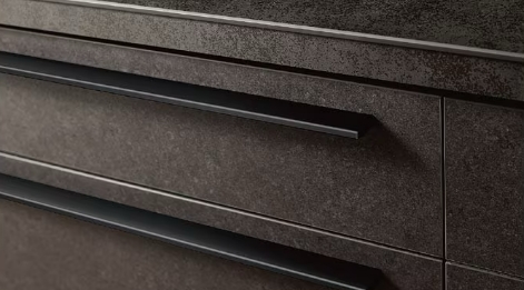 すっきりとした佇まいのハンドル取手。しっとりとしたマットな扉と組み合わせれば、落ち着いた上質な空間に。