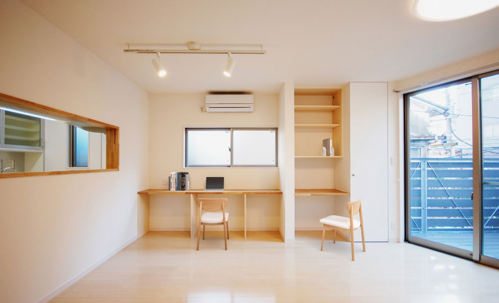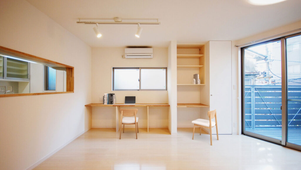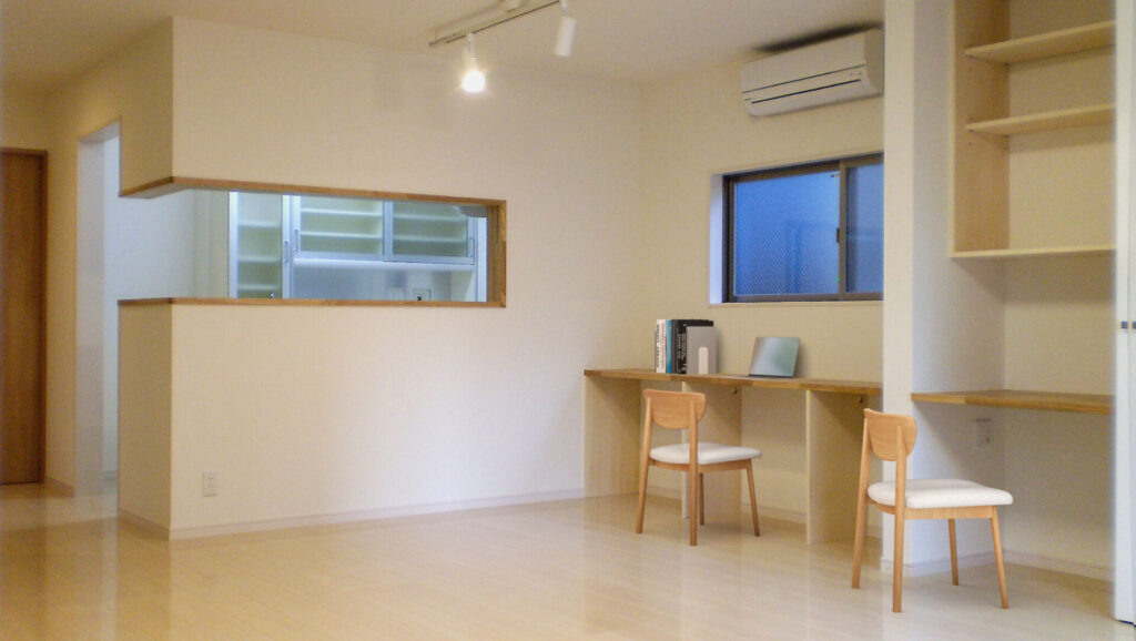 リビングの一角には、壁面を活用した造作ワークカウンターを設置。ご主人の在宅ワークスペースとしてはもちろん、お子様の宿題やリビング学習にもぴったりの空間です。家族の気配を感じながら作業や勉強ができるため、安心感と集中しやすさを両立。リビングに溶け込むシンプルなデザインで、空間を圧迫せずスマートに活用できます。