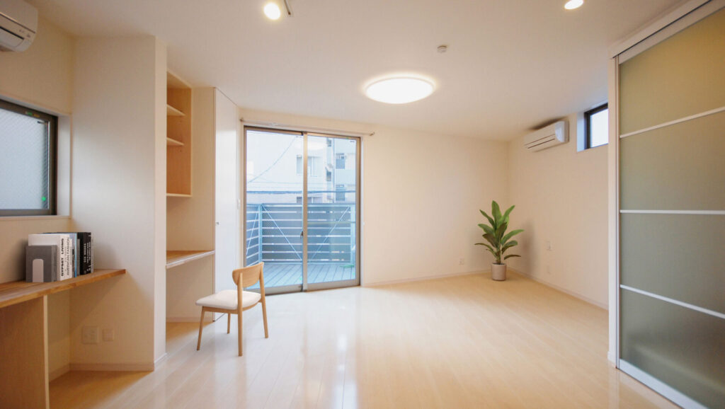 リビングには大きな掃き出し窓を設けており、バルコニーへと直接アクセスが可能。窓からたっぷりと自然光が降り注ぎ、室内全体を明るく心地よい空間に包み込みます。