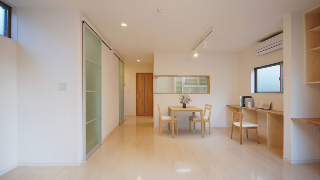 白を基調とした明るく清潔感のある室内に、淡い木目調のフローリングがやさしい雰囲気を添え、家族みんなが心地よく過ごせる空間に仕上がっています。リビングと階段室の間にはガラスの引き戸を設置し、空間をゆるやかに仕切りながらも自然光をたっぷりと取り込める工夫が。お子さまの様子に目を配りやすく、家族がどこにいてもつながりを感じられる、安心感のある設計です。
